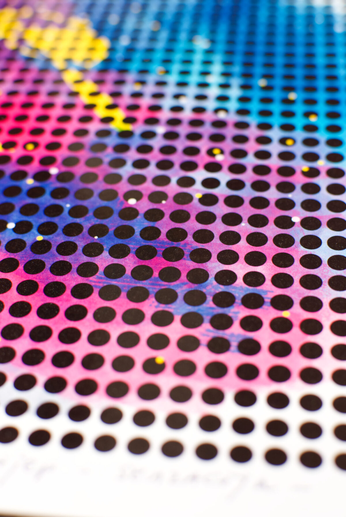 Digitalni rad iz ciklusa Vizualne stimulacije II, 2022, kreiran u Affinity Photo programu uz pomoć grafičke olovke. Dimenzije: 21×29 cm, s okvirom 30×40 cm. Inkjet print na papiru, glossy 180 g. Jedan primjerak.