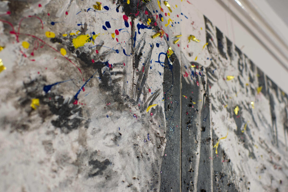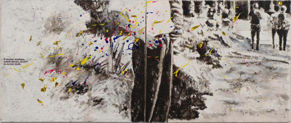 Tehnika: kombinirana tehnika, akril, akrilni lak, zlatna folija i papir na platnu